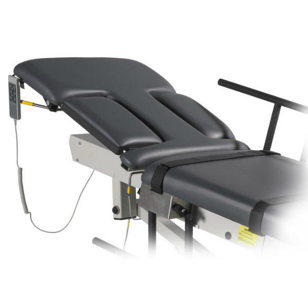- Tabletop: Two primary sections: torso section: features sonographer and patient cutouts with Fowler positioning, and lower body section remains fixed