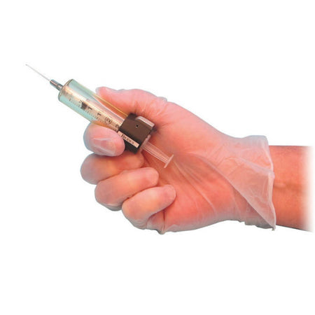 The Safe-T-Lock is designed to facilitate minimal handling, reducing hand exposure. Upon insertion, the Safe-T-Lock grips and securely locks the syringe into place. Disposing used syringes is easy; invert the syringe shield over a sharps container, press the release button and the syringe freely disengages.