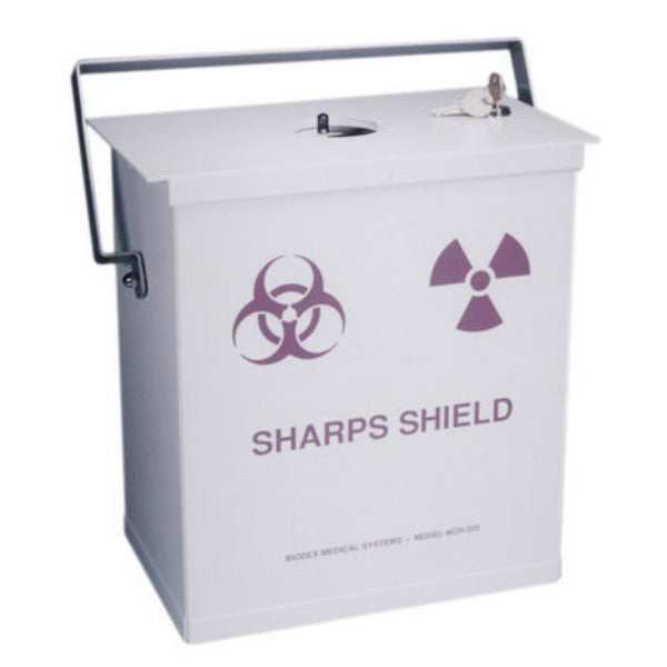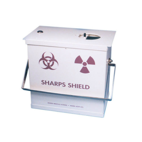 Sharps Container Shields are a simple, safe and convenient way to dispose of used syringes that may contain low-energy gamma radiation residue. The shields are constructed of steel lined with .125" (.32 cm) lead. They feature a top with sliding port and a swing handle that allows easy transport.