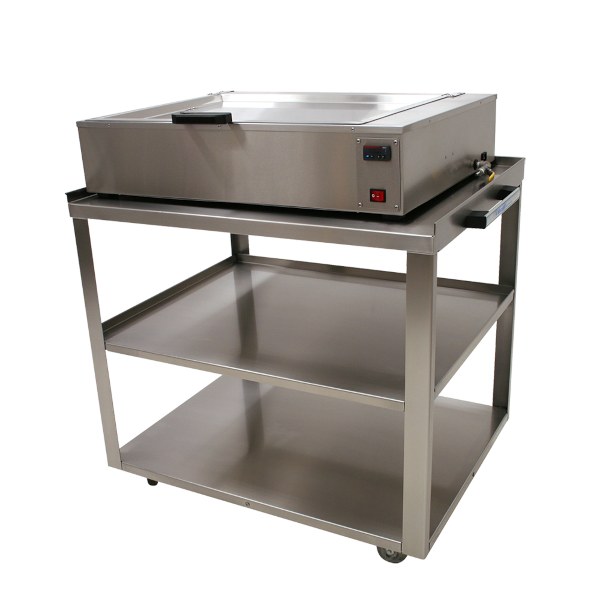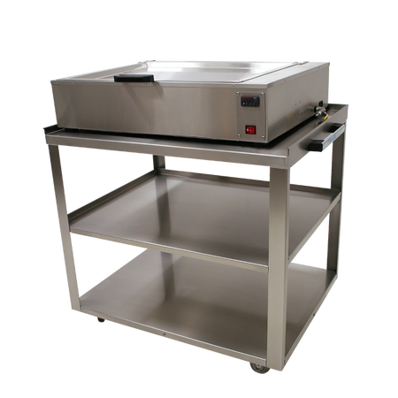 The Thermoplastic Prep Cart is ideal for use with a water bath or RapidHeat™ Oven. The cart has four wheels for easy maneuverability of the cart and heating appliance. The cart features two open shelves to store Fibreplast® and Aquaplast RT™ masks and/or accessories. The stainless steel cart is easy to clean.