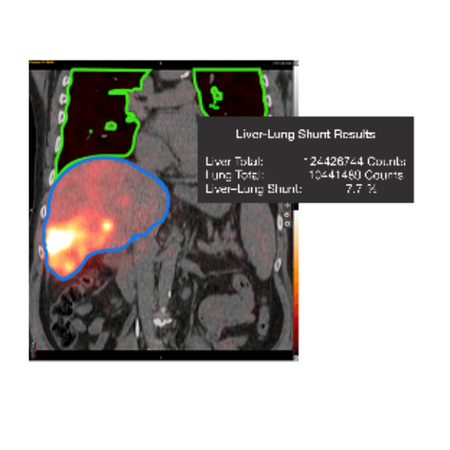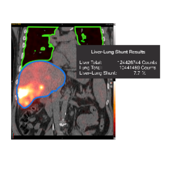 - Calculate liver-lung shunt fraction from both planar and SPECT images.