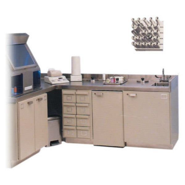 The wall rack improves work space with its pigeonhole design and reduces unnecessary handling. Unit doses can be identified at a glance. The rack's sturdy construction will hold up to 25 unit dose pigs.